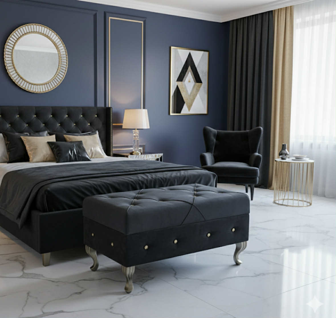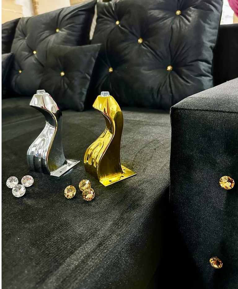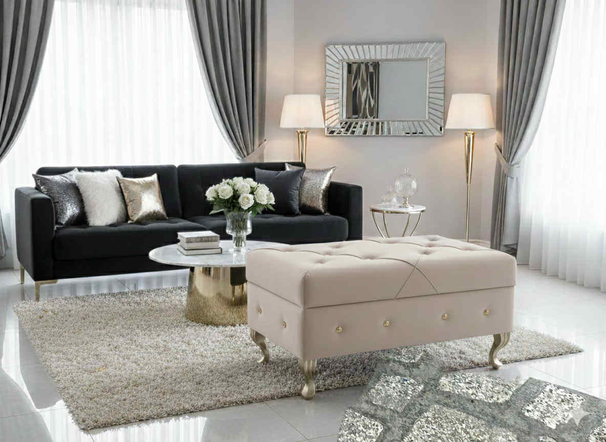 - Styl glamour – zdobienia kryształkami na bokach oraz klasyczne, rzeźbione nogi w stylu ludwikowskim nadają pufie wyjątkowy, luksusowy wygląd, który świetnie wkomponuje się w różnorodne aranżacje wnętrz.